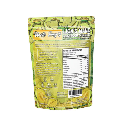 Unlock the door to the multiverse and enhance your daily routine with Uncle Frog’s Lion’s Mane Mushroom Gummies infused with industrial hemp extract. This pack consists of 8 zesty-flavored gummies, each serving containing 2000 mg of mushroom extracts and 100 mg of hemp for better memory and focus. The main active ingredient is Hericium erinaceus.